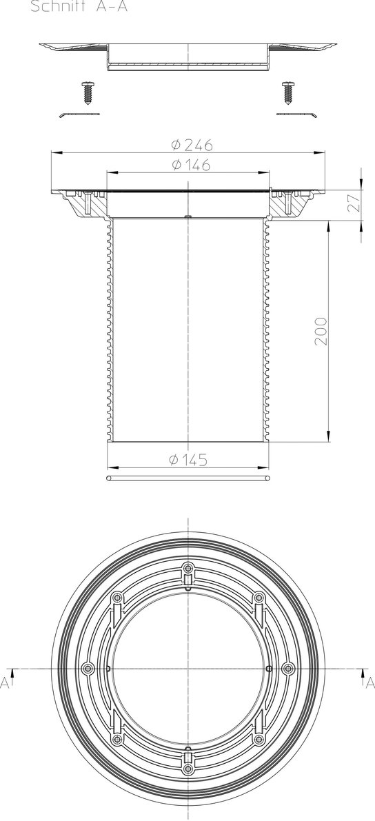 Скачать страницуНадставной элемент высотой монтажа 200 мм с тарелкой для подхвата гидроизоляционного слоя, с резиновым уплотнительным кольцом
