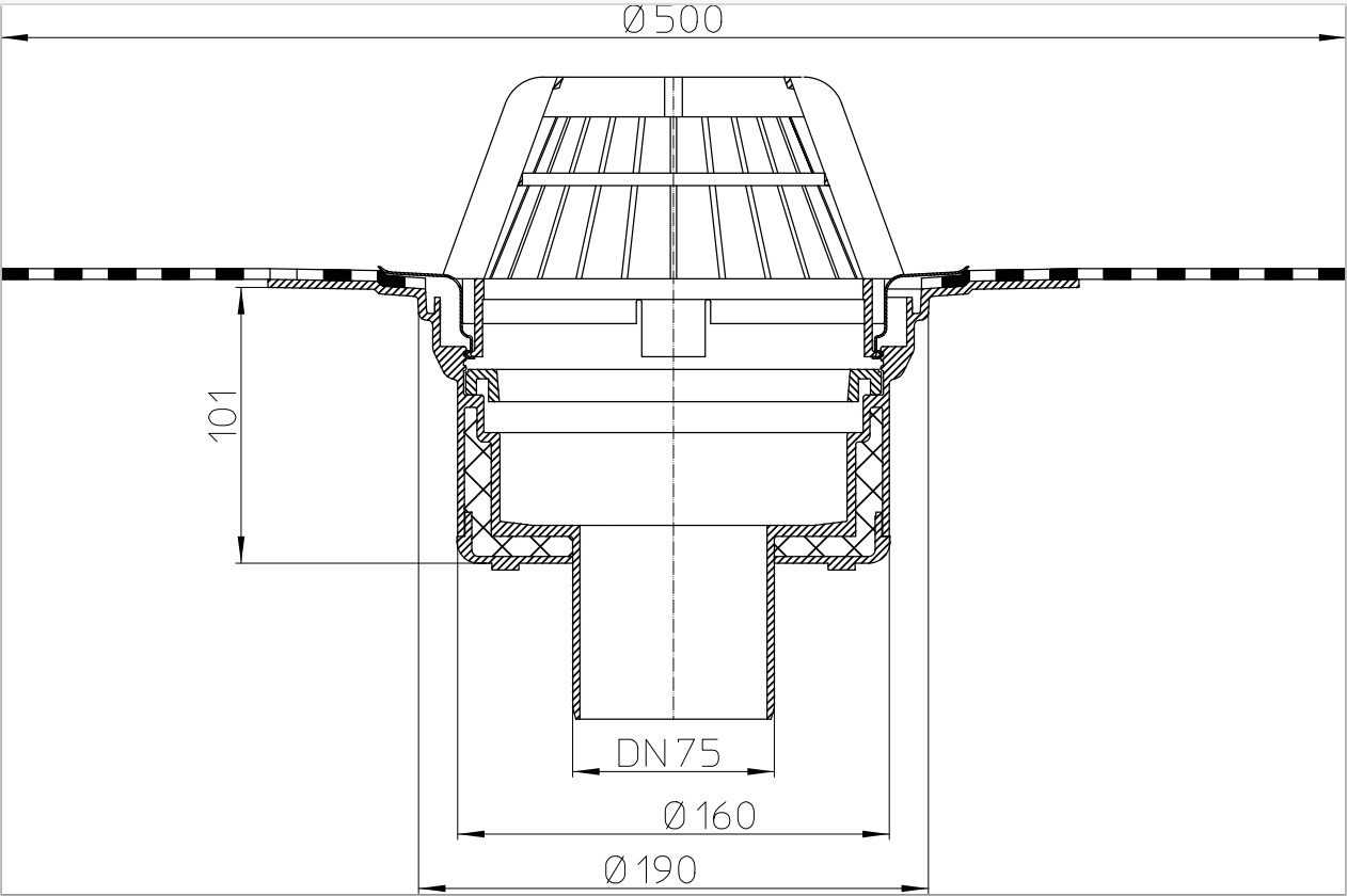 Скачать страницуКровельная воронка с вертикальным выпуском с листвоуловителем из ПП и с «фартуком» из гидроизоляционного полимербитумного полотнаб DN75