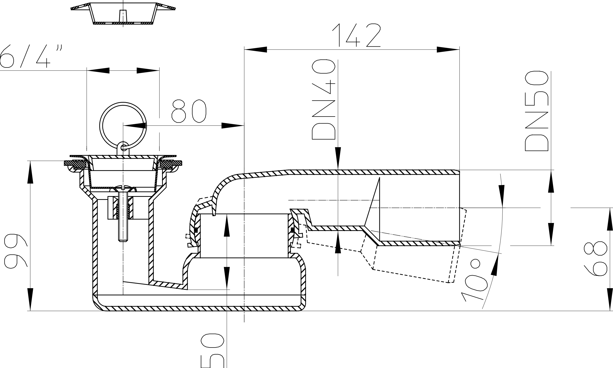 Скачать страницуСифон для душевого поддона DN40/50 со сливным отверстием 52 мм, с поворотным шарниром 280° по горизонтали и 10° по вертикали, с пробкой 6/4", с пластиковой сеткой для улавливания волос и мелкого мусора HL526. Высота гидрозатвора 50 мм