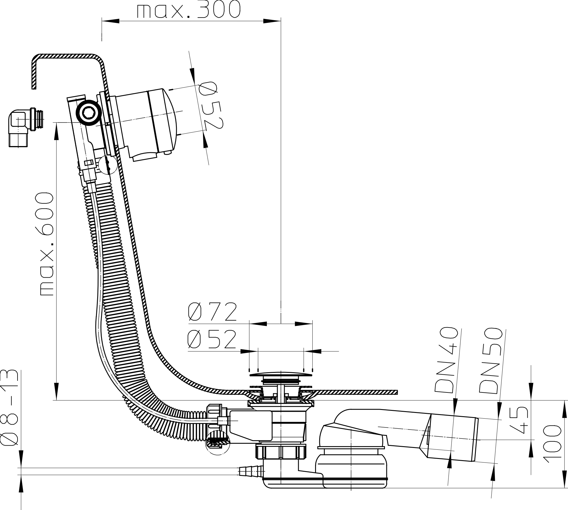 Скачать страницуВыпуск-полуавтомат для ванн 6/4", с горизонтальным выпуском DN40/50 с поворотным шарниром 280° по горизонтали и 10° по вертикали, со сливным отверстием диаметром 60 мм, с нормально заглушенным штуцером для подсоединения дренажной трубки от 8 до 13 мм. Новая улучшенная разработка с новым механизмом зубчатой рейки для точного хода, с возможностью подключения для подачи воды слева и справа 3/4, перлатор, двойная прокладка для тарелки для слива, трос Боудена из нержавеющей стали (CrNi 18/10) длиной 80 см и прочный запирающий механизм для высокой работоспособности сифона и его долгой эксплуатации, видимые части - хромированные.
